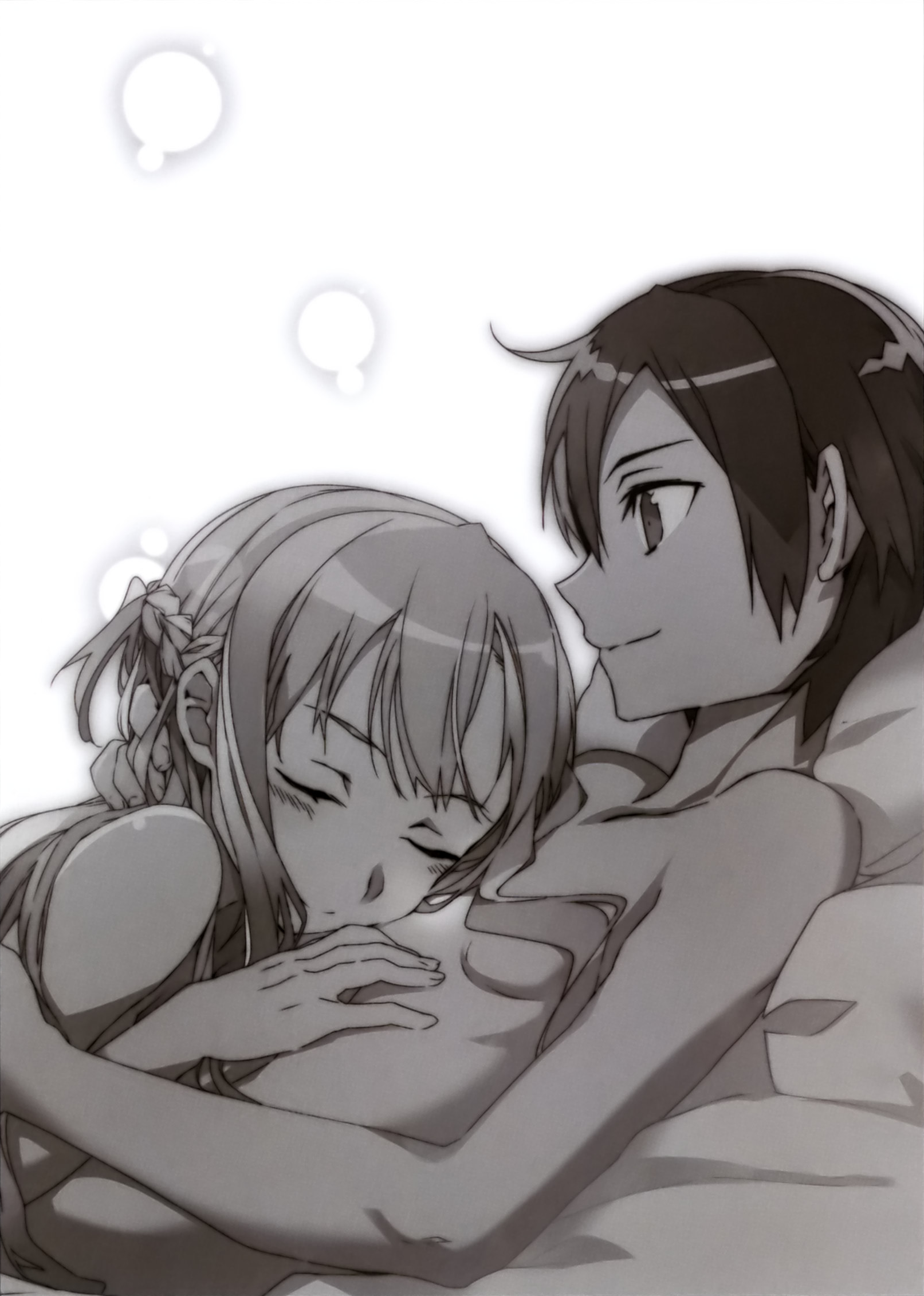 Abracé a Asuna con fuerza como para repeler la ansiedad y la inquietud. No fue un abrazo lleno de tranquilidad como el de cuando me le propuse; Puse fuerza en mis brazos en mi deseo de sentir toda la existencia de Asuna. Tanto Asuna como yo nos habiamos quitado la armadura metálica, por lo que la sensación de su cuerpo esbelto pero claramente tangible fue transmitida a mí.